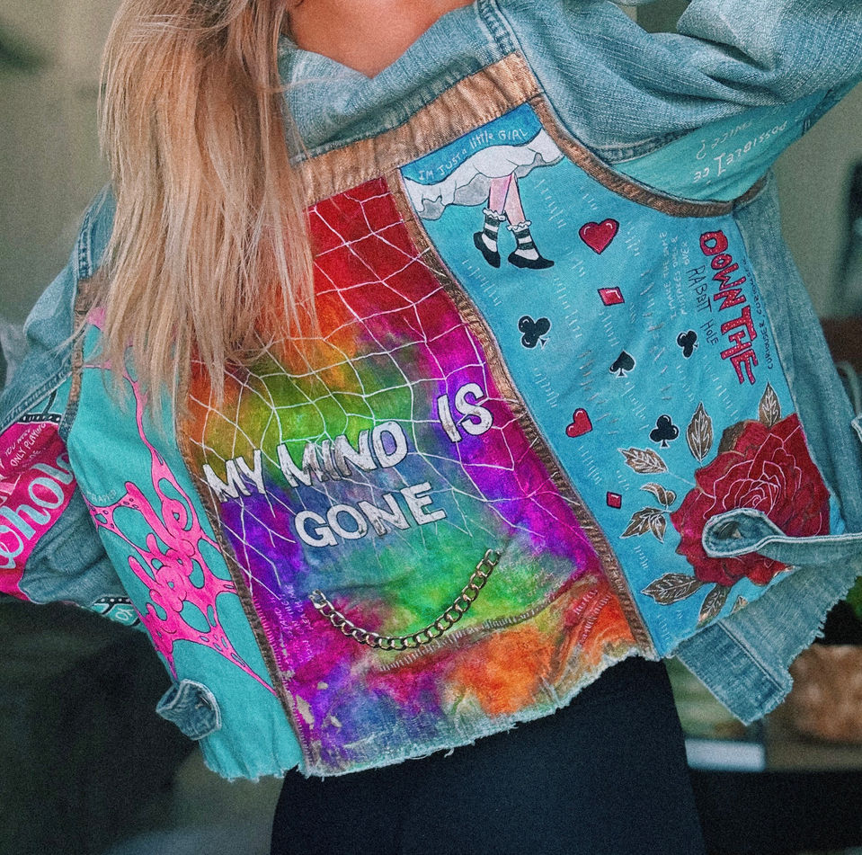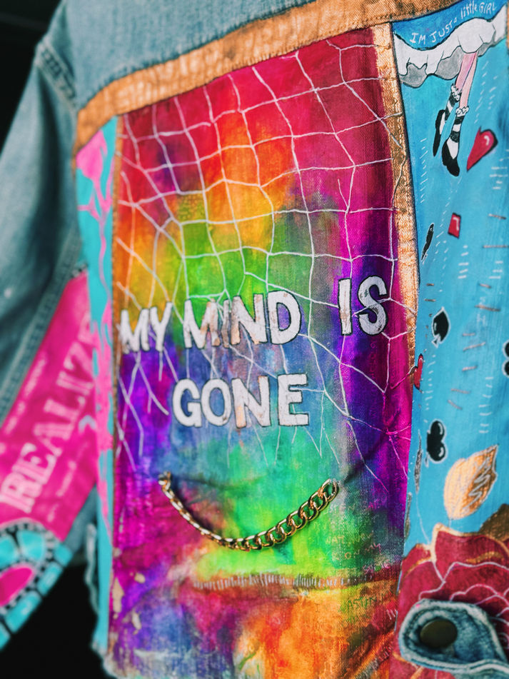 I created a book presenting the stories behind my sculptural paintings through graphic design. To complement it, I designed and painted a jean jacket, treating it as a canvas and incorporating elements from ten different paintings. This project was completed at Otis College of Art & Design in Los Angeles.